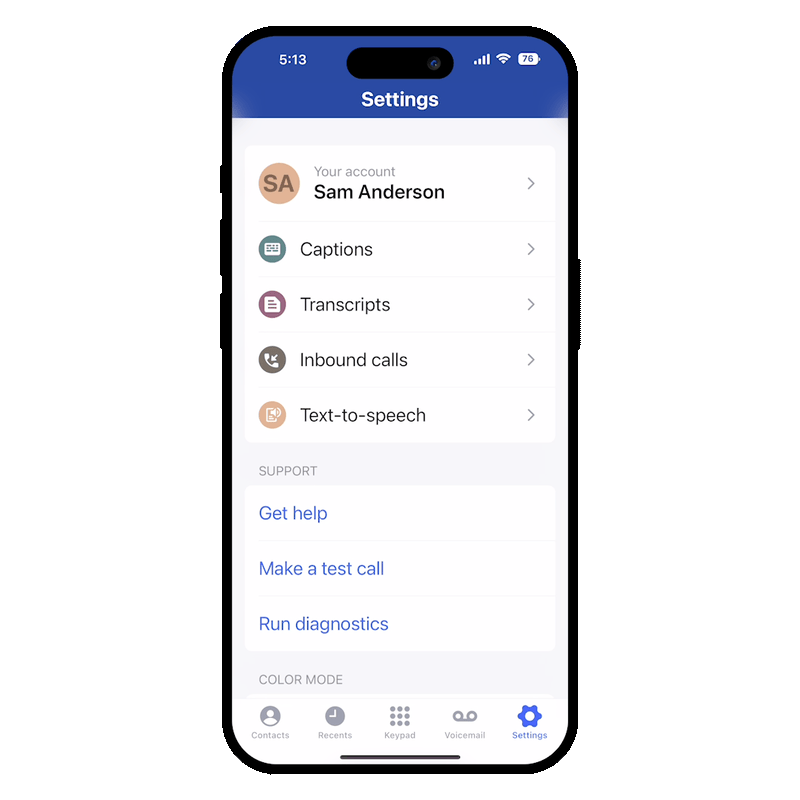 View captions on your cell phone while sending the call audio to a landline phone for outbound calls. This feature is great for longer calls where you prefer to use a landline handset at home or at work to listen to audio. Find this feature under Settings > Dialer.